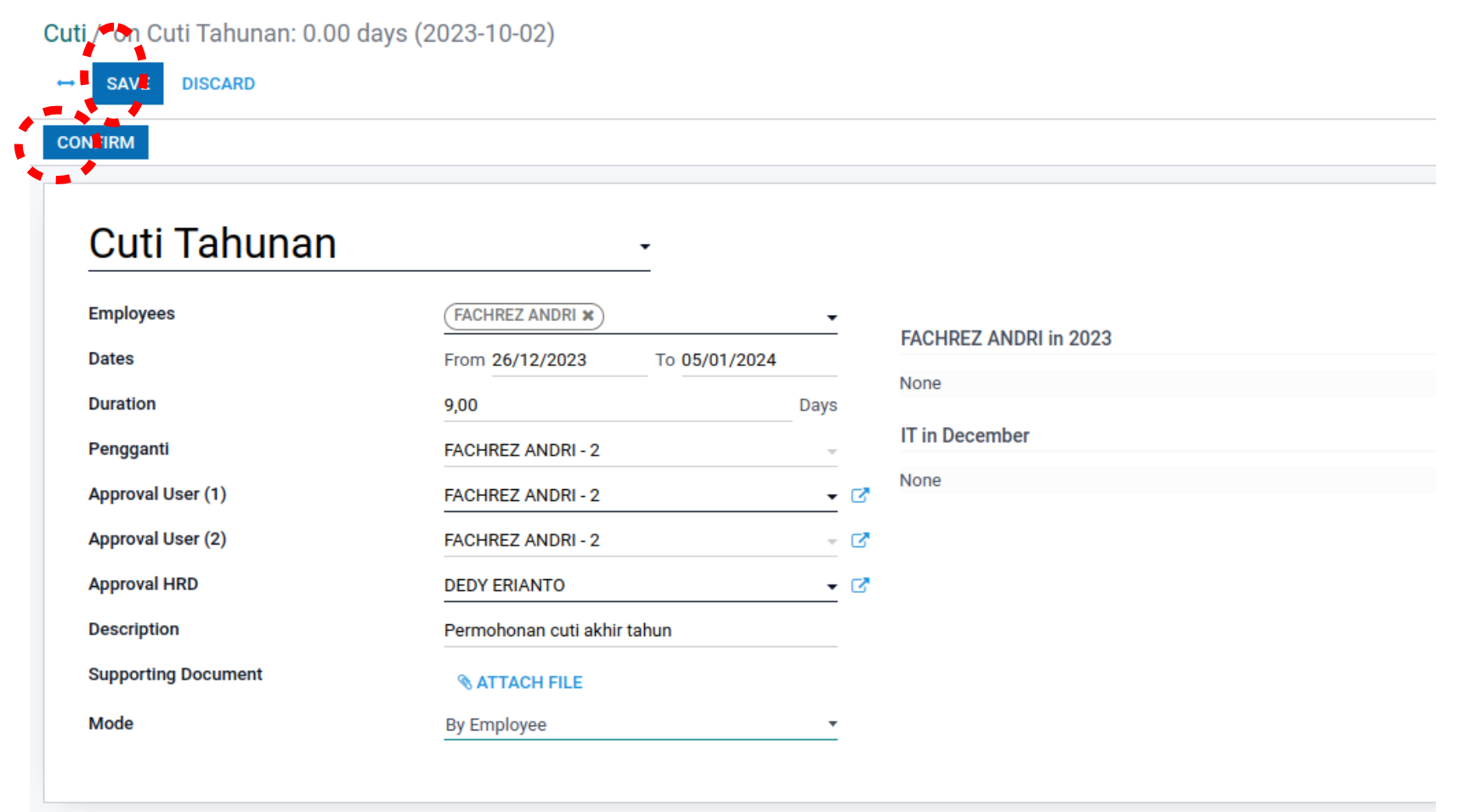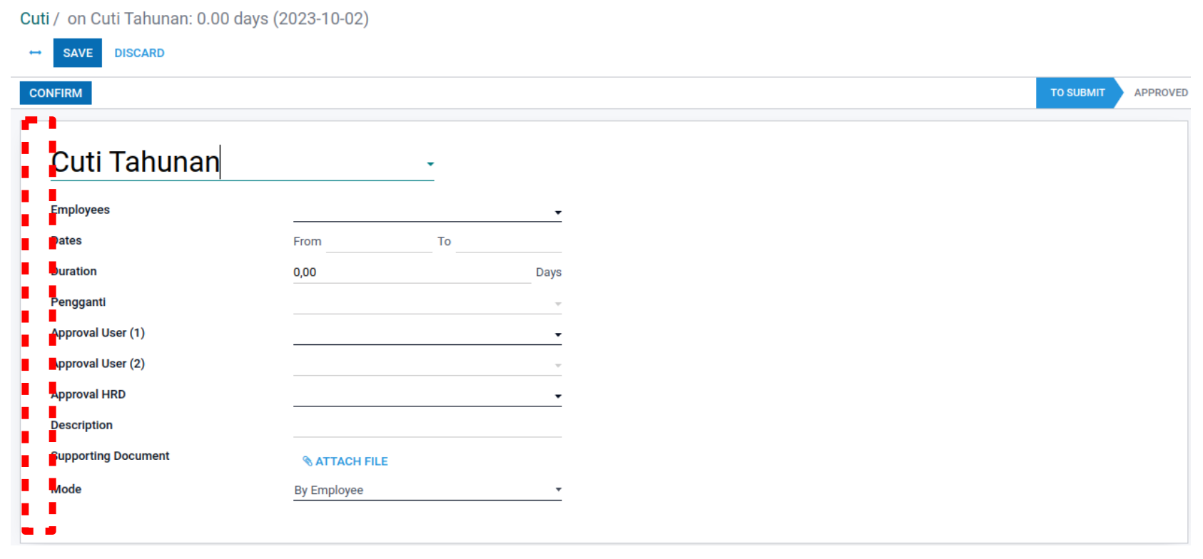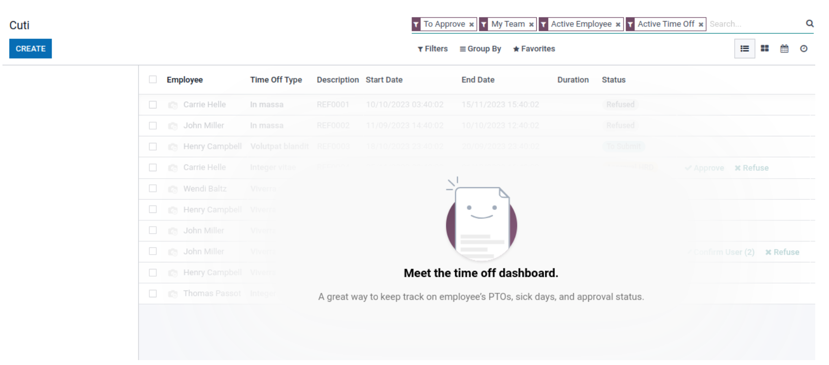 Pada gambar diatas, tidak terdapat data pada menu Cuti ini. Selanjutnya, kita akan menambahkan data Cuti dengan klik “Create” pada bagian atas sebelah kiri,