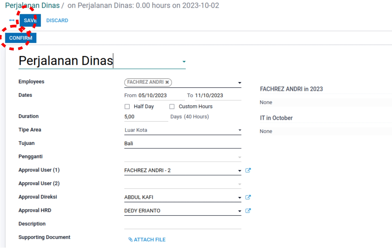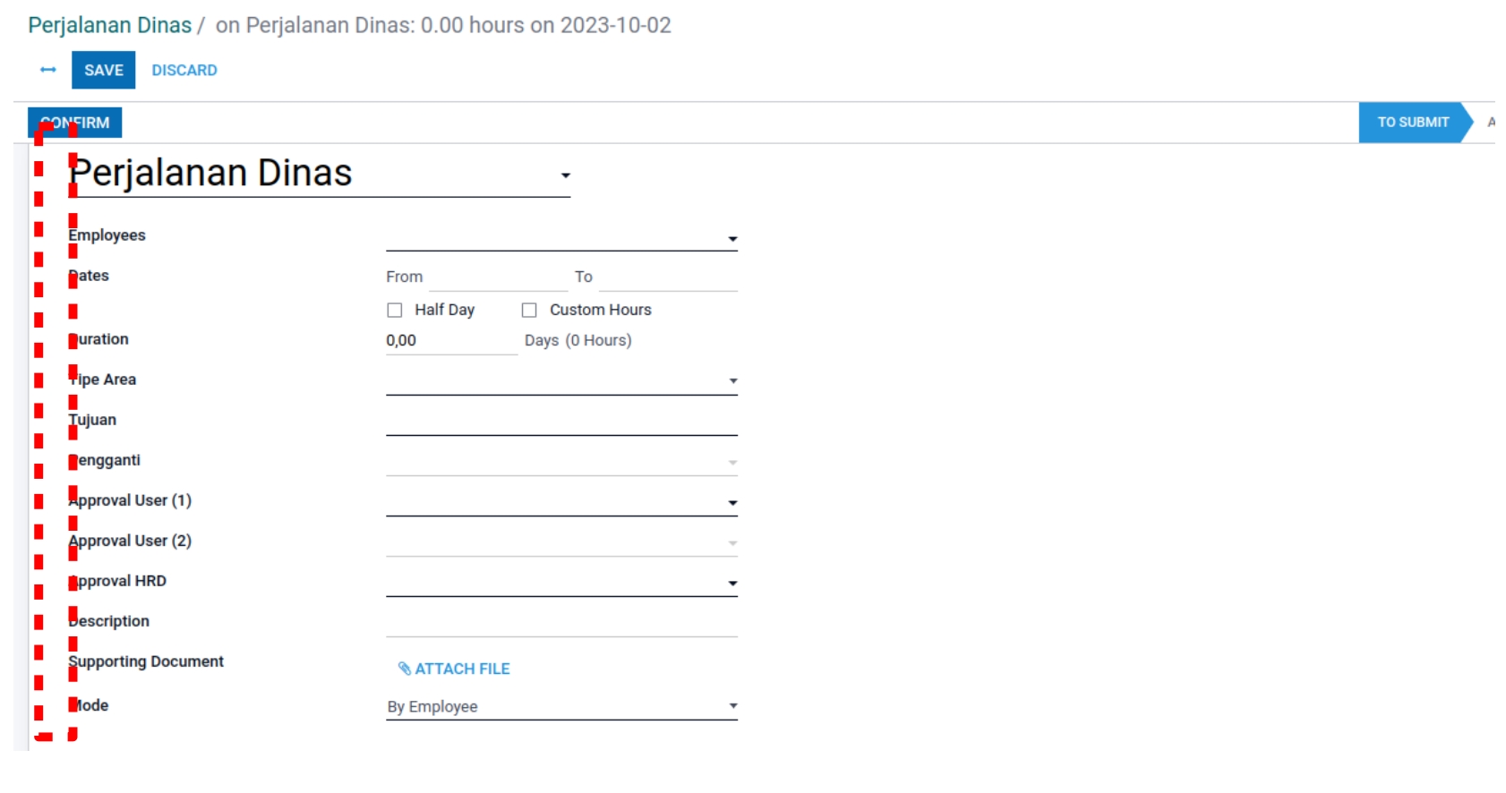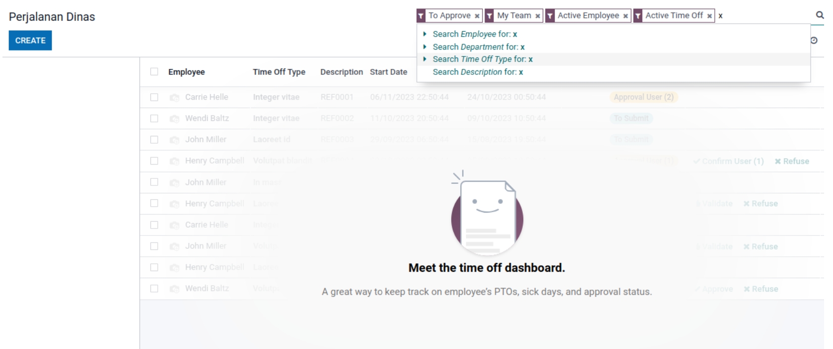 Tidak terdapat data Perjalanan Dinas pada gambar diatas. Lalu kita akan mencoba membuat dan menambahkan data baru Perjalanan Dinas dengan klik (Create) pada bagian atas sebelah kiri.