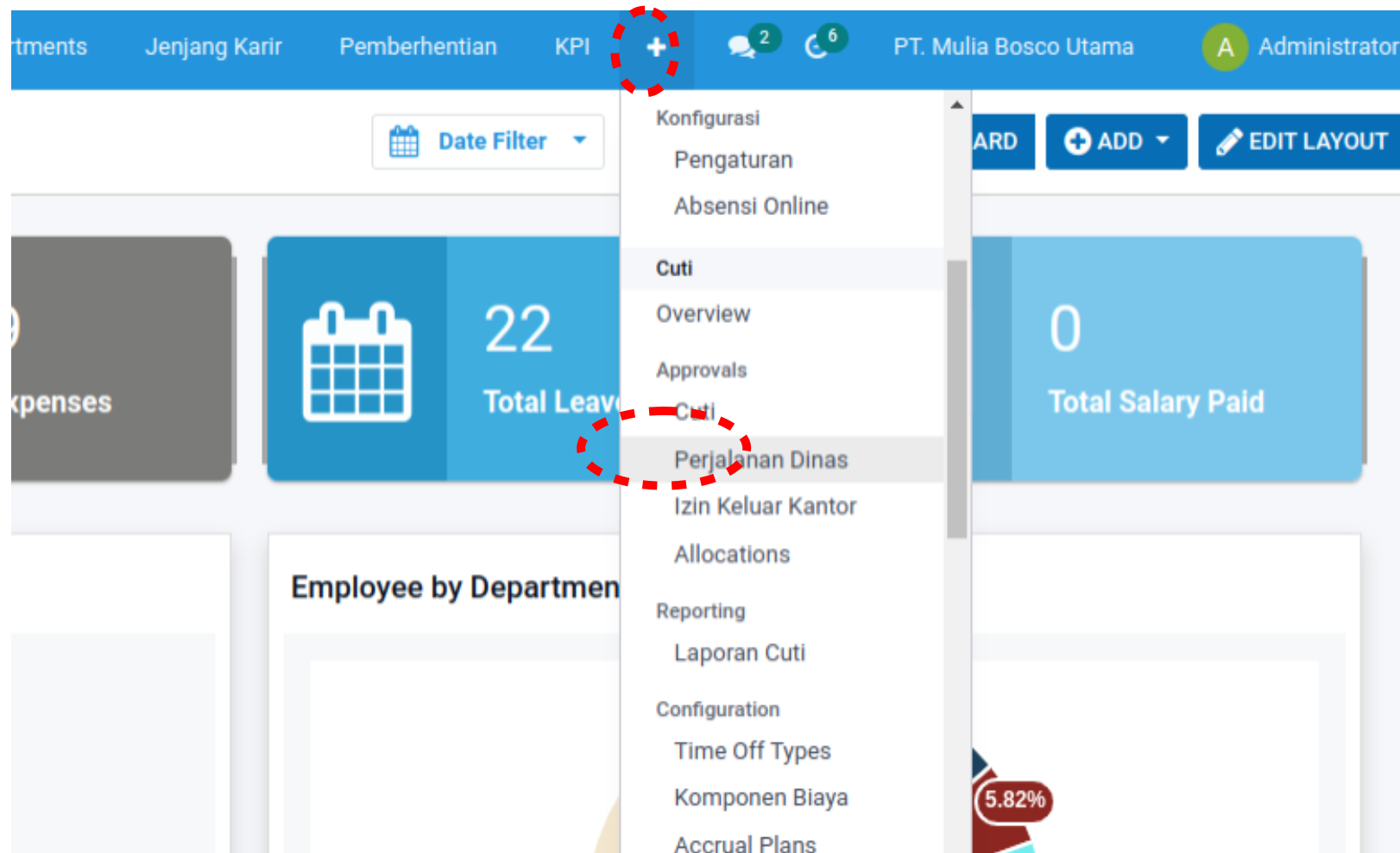 Pada bagian ini, kita akan masuk kebagian Perjalanan Dinas, dengan klik tanda (+) yang terdapat pada bagian atas sebelah kanan lalu scroll kebawah, tepat dibawah “Cuti”, klik “Perjalanan Dinas”