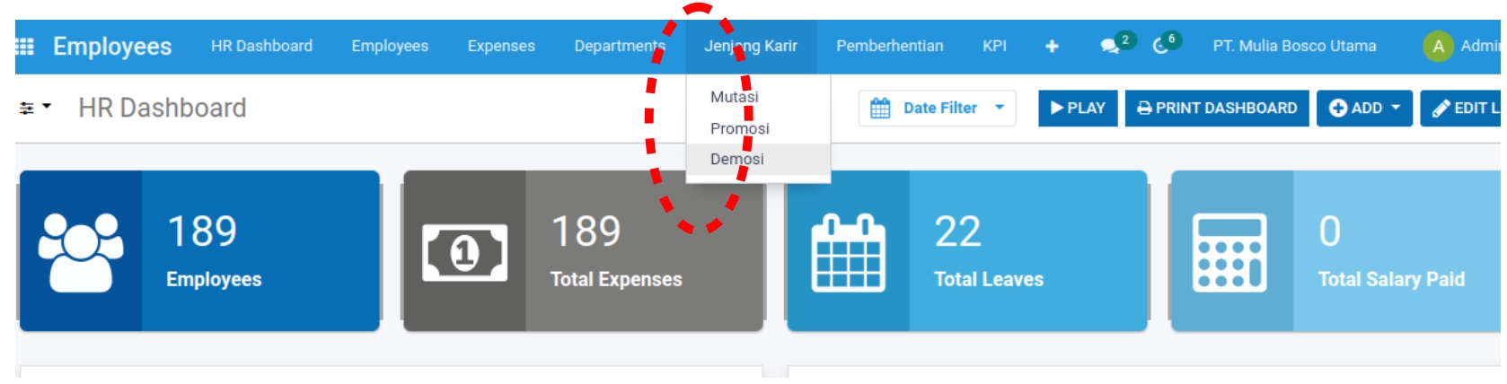 Pada bagian ini, kita akan masuk ke bagian Demosi dengan klik “Jenjang Karir” pada bagian atas tengah, lalu akan muncul 3 pilihan, dan pilih “Demosi” seperti gambar dibawah ini,