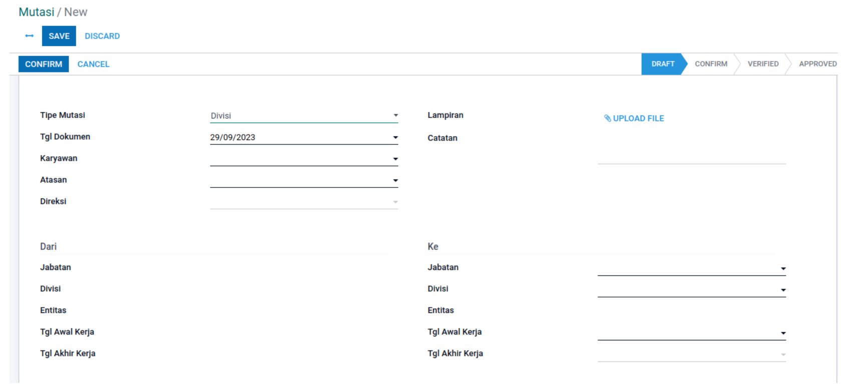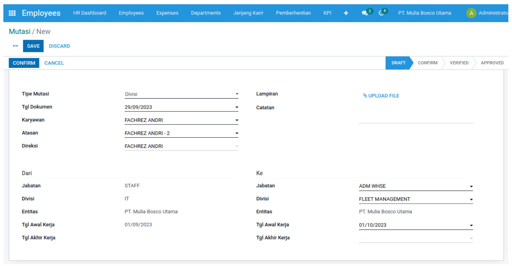 Dalam gambar diatas kita dapat melihat 1 form yang telah dibuat dan terdapat tabel yang berisi No. Dokumen, tanggal, karyawan yang dimutasi, catatan, status. Jika file form tersebut diklik, maka akan menampilkan data-data karyawan mutasi secara lengkap.