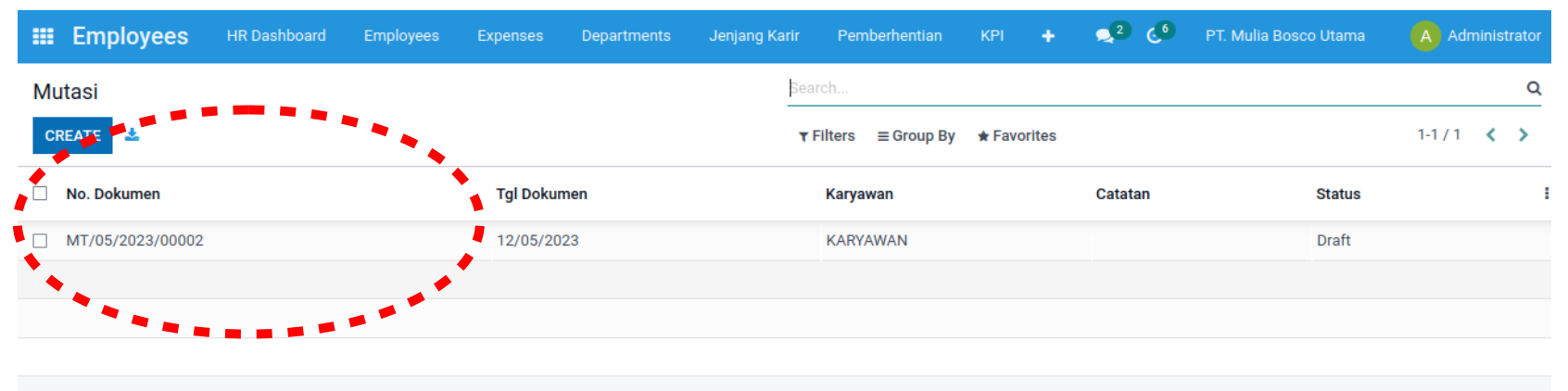 Setelah itu kita akan mencoba untuk membuat dan menambah file baru (Create) pada bagian mutasi ini, dengan cara user dapat klik “Create” pada bagian kiri atas