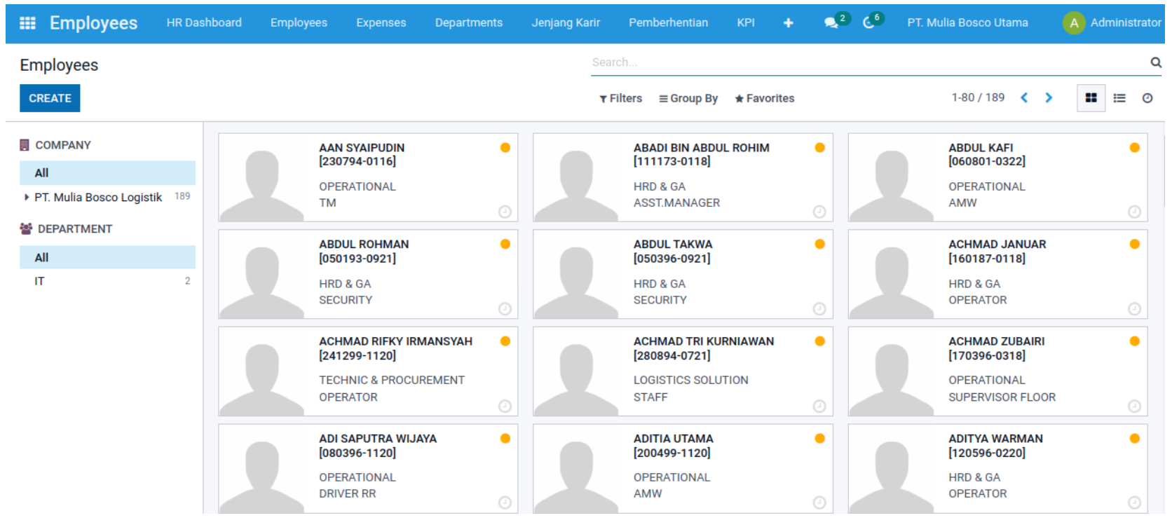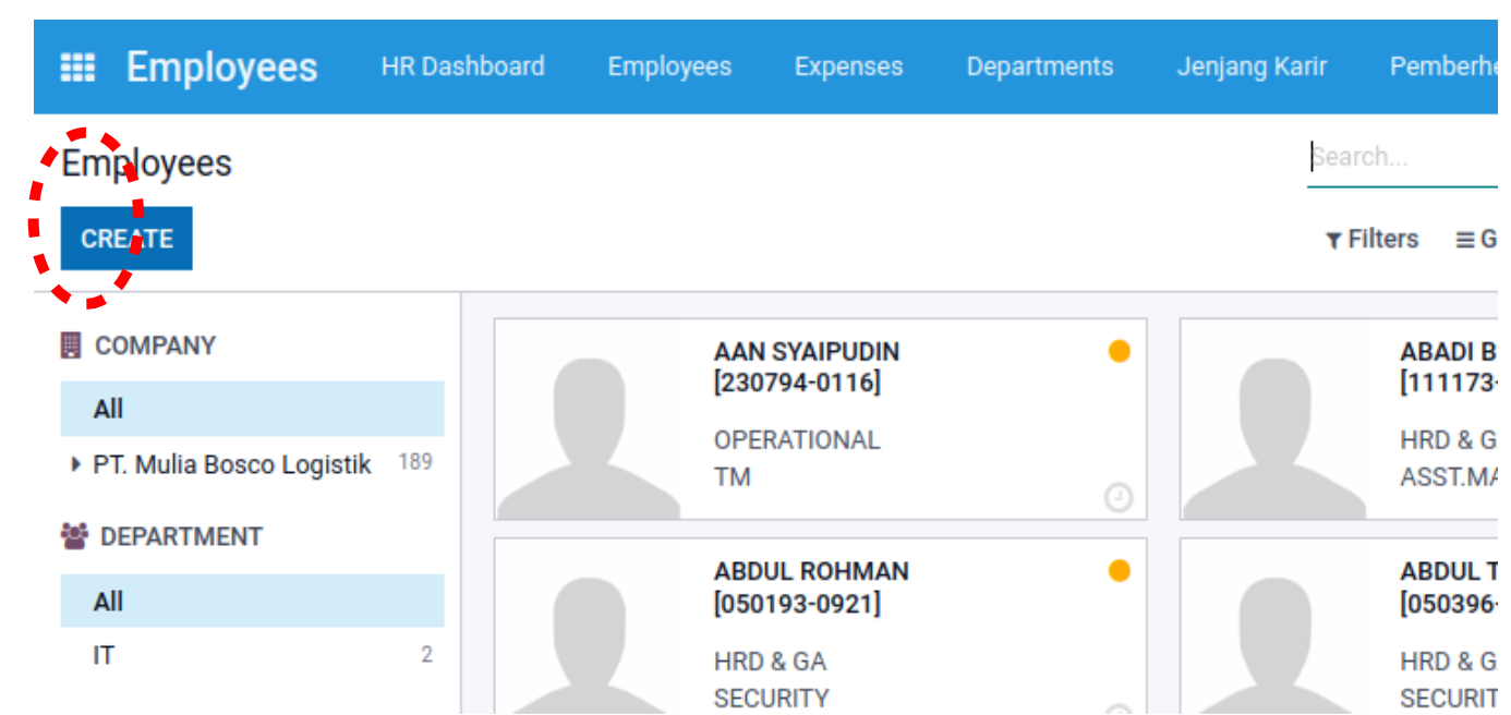 Pada tampilan ini, user dapat menambahkan (create), merubah (edit), dan mencari (search) data karyawan. User juga dapat memfilter pecarian sesuai dengan Company dan Department yang dituju.