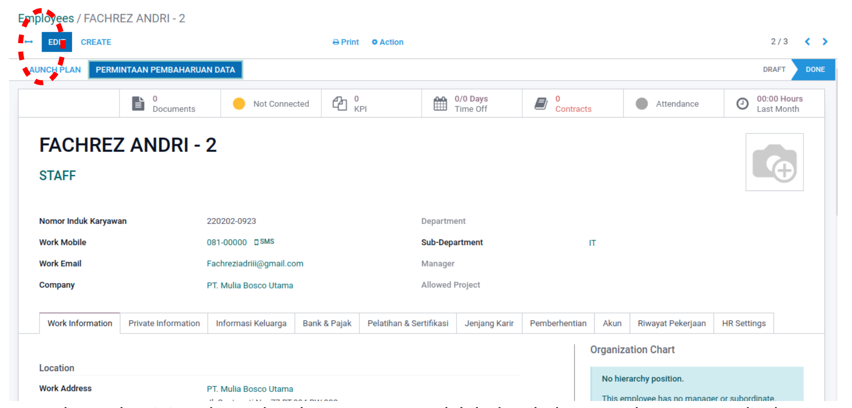 Pada gambar ini terdapat data karyawan secara lebih detail, dan user dapat mengedit data yang telah ada tersebut sesuai kebutuhan dengan klik “Edit” pada bagian atas sebelah kiri