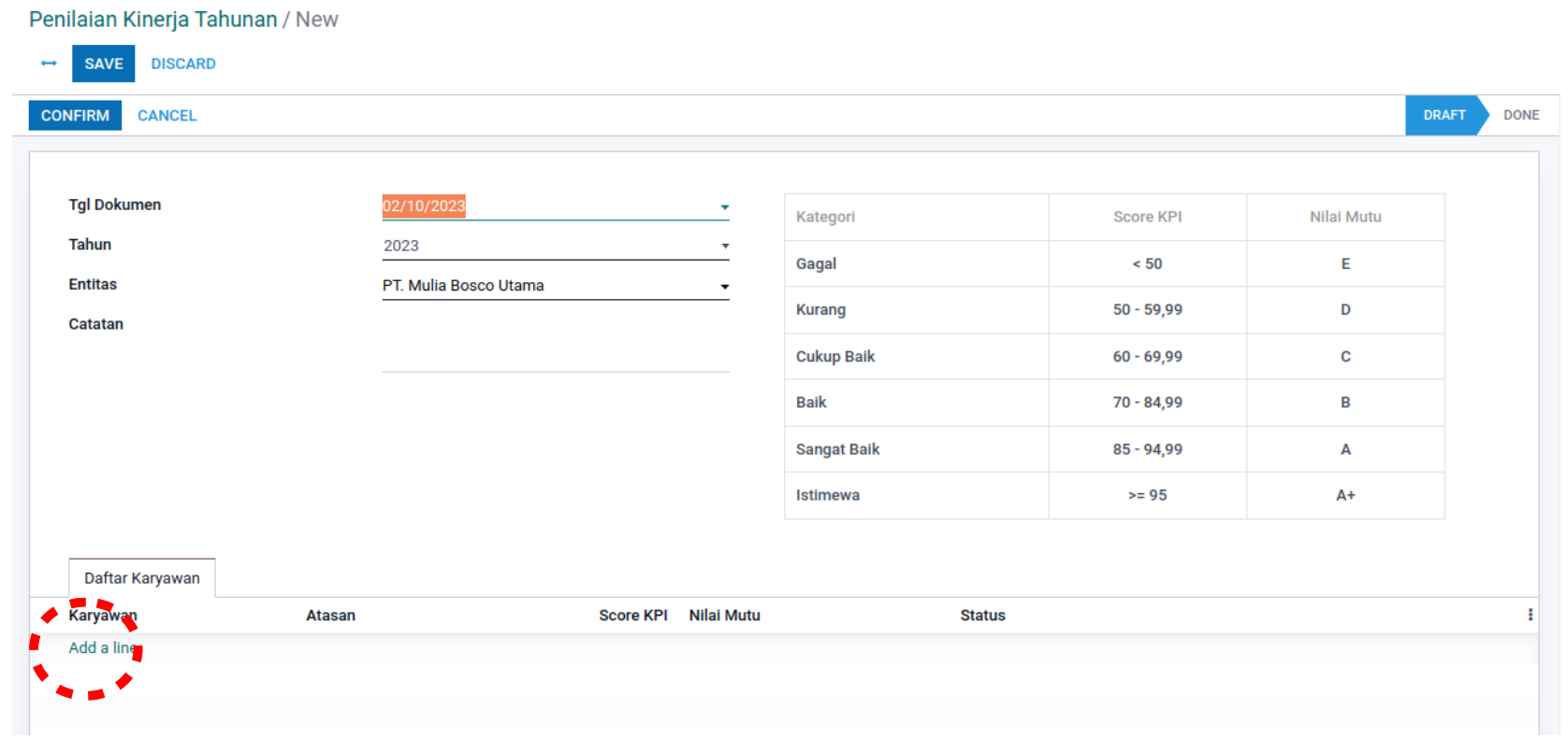 User dapat mengisi form tersebut secara lengkap dengan klik “Add a line” pada bagian Daftar Karyawan. Lalu akan muncul tampilan form seperti dibawah ini.