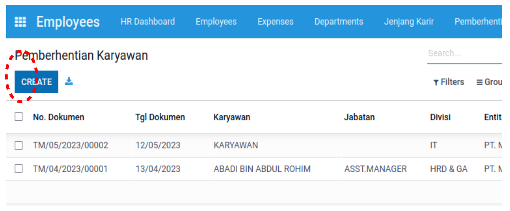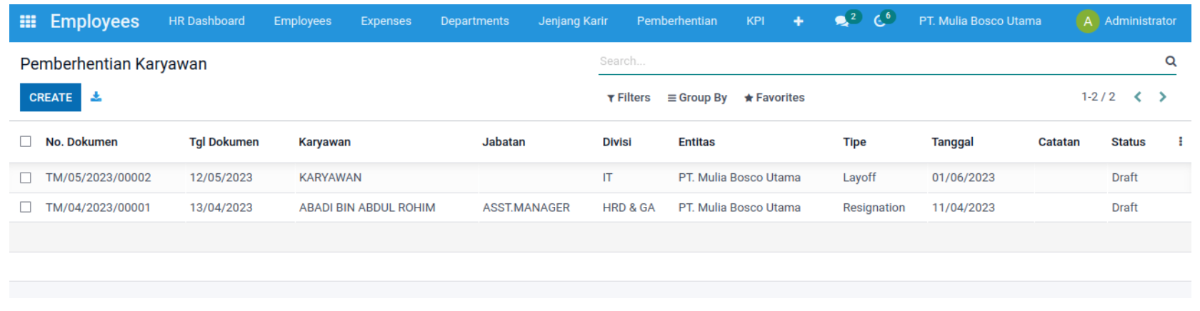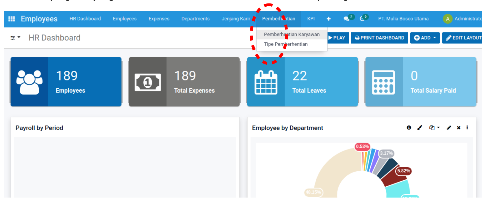 Setelah itu, klik pada “Pemberhentian Karyawan”, dan akan muncul tampilan seperti dibawah ini