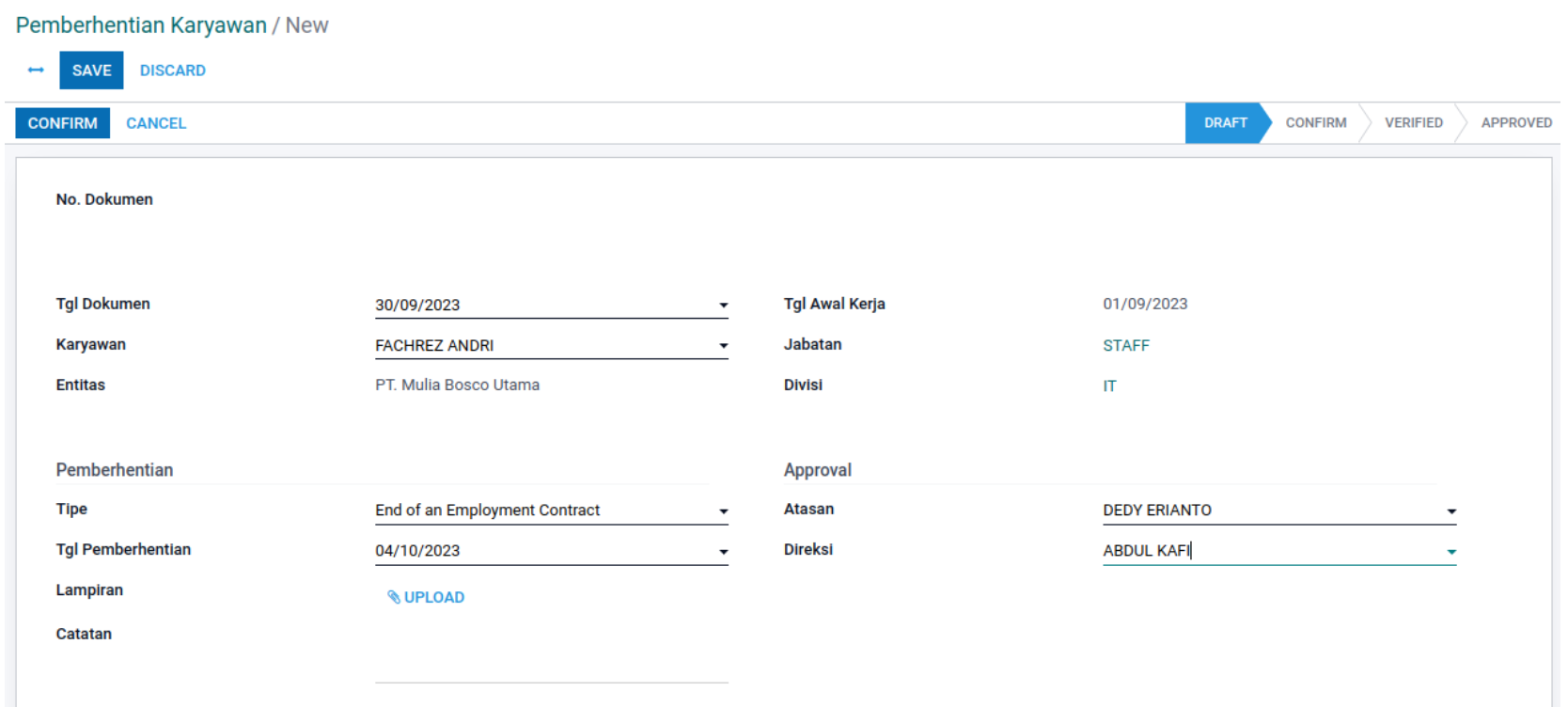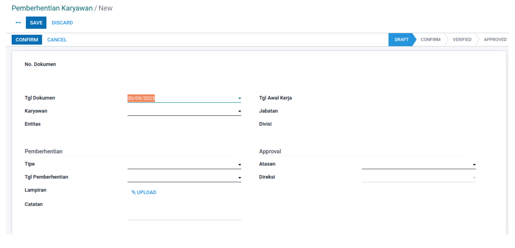 Selanjutnya kita akan mencoba mengisi form sebagai contoh “Pemberhentian Karyawan” tersebut, seperti dibawah ini